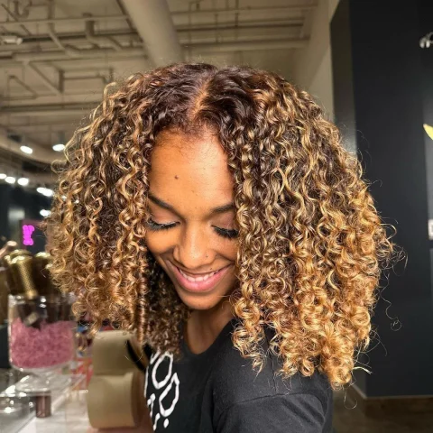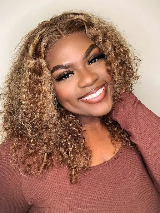 Curly Short Bob Wig Highlight 4/27 Honey Blonde 100% Lace Front Wig Deep Wave Virgin Human Hair